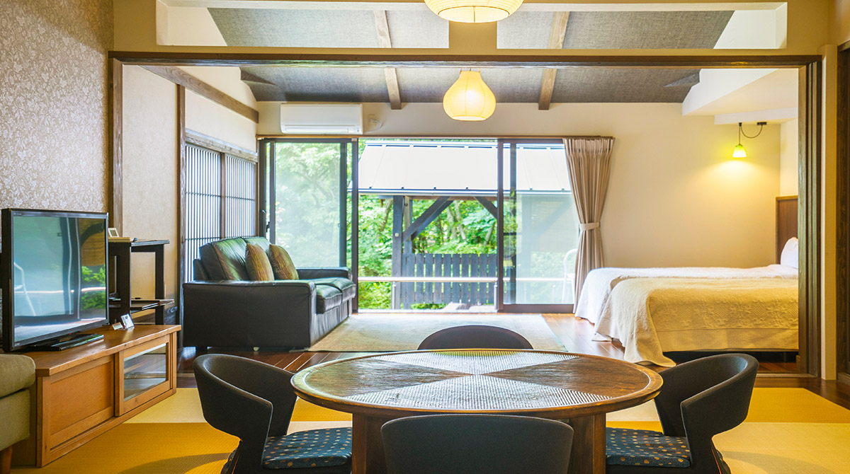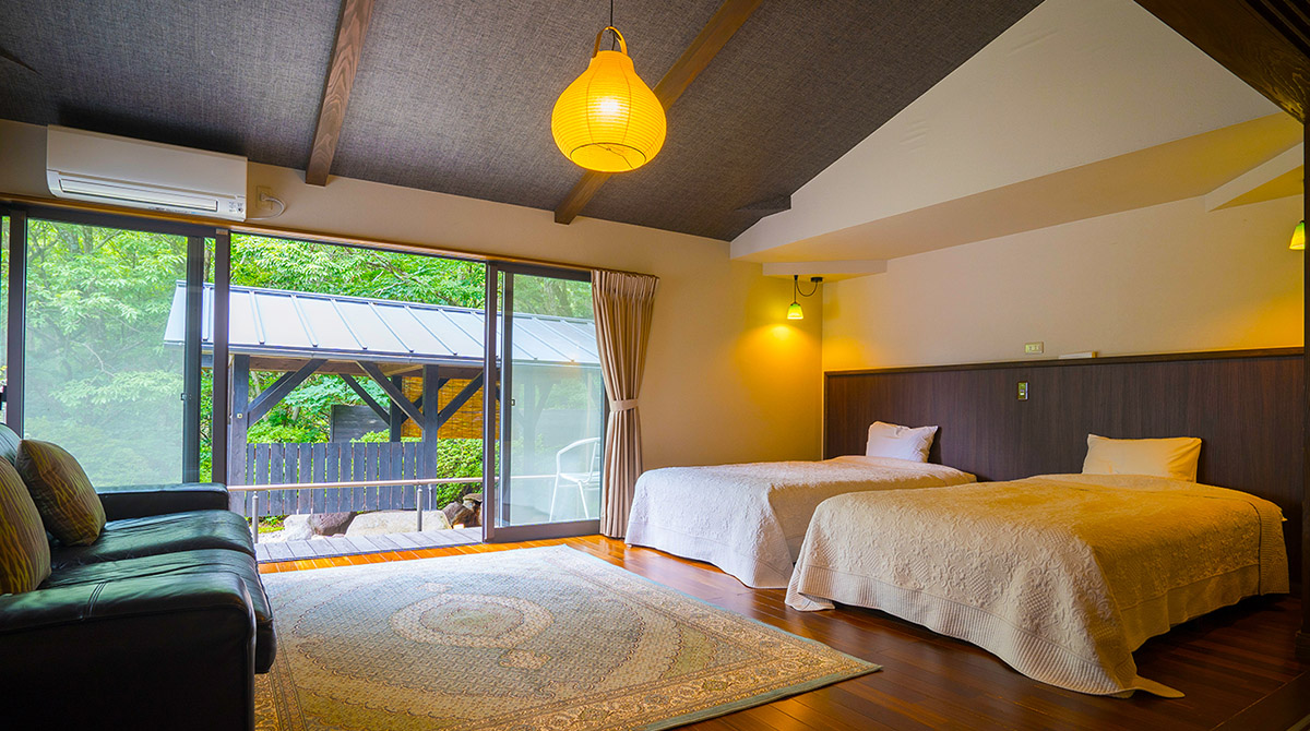 玄関を開ける和室・洋室・露天風呂が一気に見える広々とした空間が目に飛び込んでくる。平屋別荘のような贅沢な造りの客室にはセミダブルのベッドを2台配した和室とリビング、そして源泉かけ流しの露天岩風呂と木のぬくもりを感じる内湯がついたお部屋となっています。